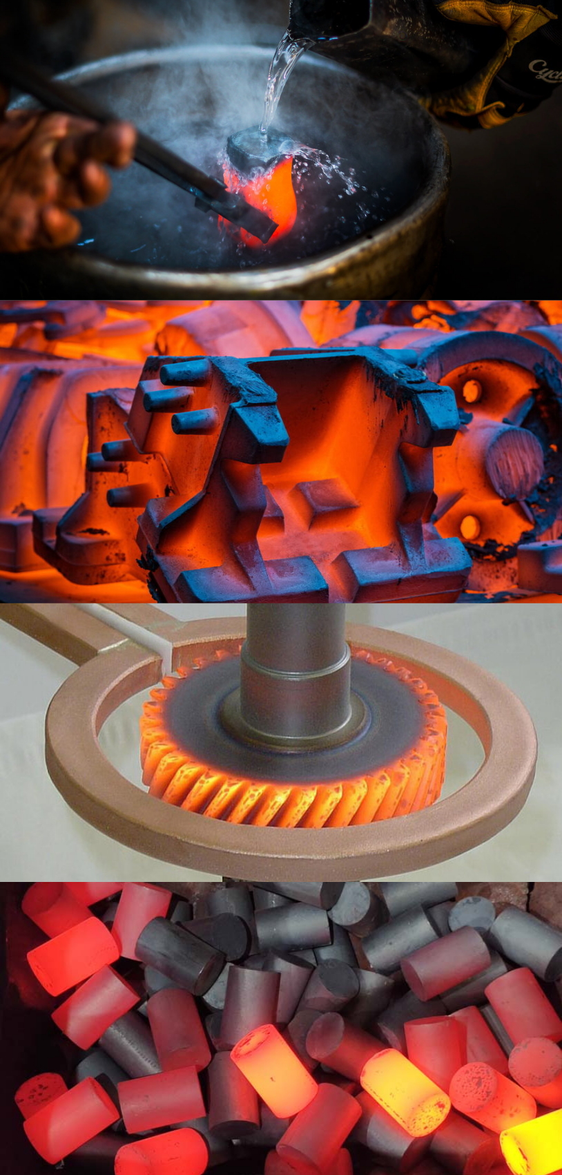 • La trempe : chauffage de la pièce à une température élevée suivie d’un refroidissement rapide (souvent dans de l’eau, de l’huile ou de l’air). Cela transforme la structure métallique en martensite, très dure mais fragile.